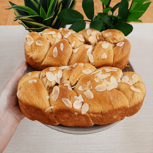 ( Có thể dùng nồi chiên không dầu thì cứ 10 phút lại mở nồi xịt nhẹ nước trên bề mặt để tránh bị khô và vỏ bị dày ). Bánh gần được hoặc được rắc thêm hạnh nhân đã được cắt lắt mỏng.