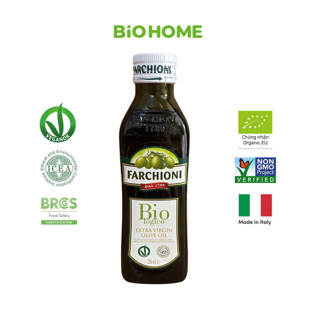🫒Dầu oliu nguyên chất ép lạnh hữu cơ Farchioni 250ml là dầu Extra Virgin đạt chuẩn EU Organic, được ép cơ học từ những trái oliu Ý tuyển chọn. Sản phẩm có màu xanh tươi, hương trái cây nhẹ và hậu vị cân bằng, phù hợp cho chế biến món ăn và sử dụng hằng ngày.