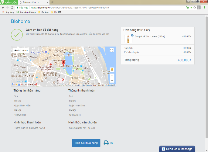 Bước 4. Bạn sẽ được xác nhận đã đặt hàng thành công. Tiếp tục thực hiện mua hàng hoặc đợi điện thoại xác nhận và nhận hàng từ đội ngũ nhân viên của Biohome.