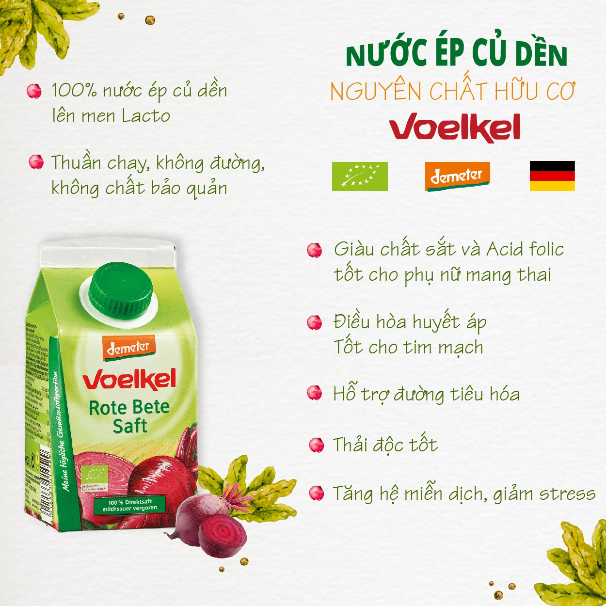 Với công nghệ sản xuất cao, các loại nước ép hữu cơ Voelkel giữ được độ tươi ngon của rau củ quả đồng thời đảm bảo được lượng vitamin có trong thực phẩm, mùi vị hấp dẫn của các loại đồ uống này sễ khiến bạn thích thú và khiến cho việc bổ sung vitamin – Sinh tố - Vệ sỹ của cơ thể mỗi ngày trở thành một thói quen vô cùng hạnh phúc.