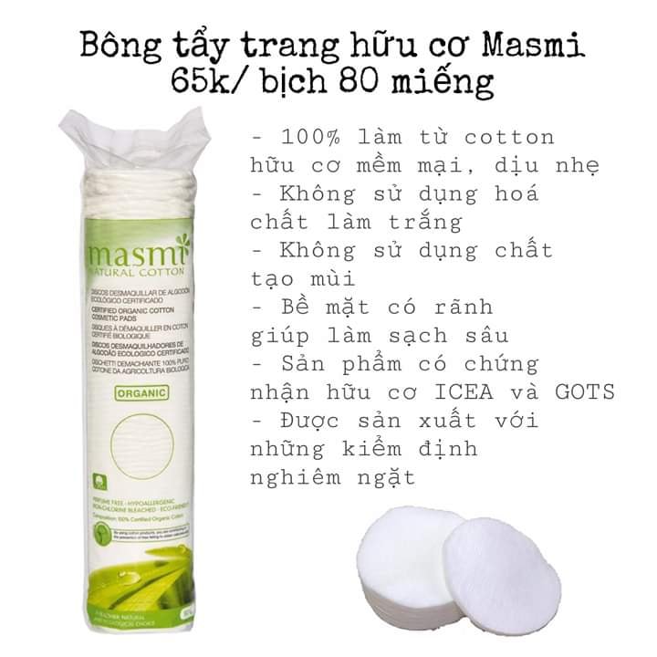 Bông tẩy trang hữu cơ Masmi của Công ty CP BGROUP được sản xuất trên công nghệ tiên tiến hiện đại với những kiểm định nghiêm ngặt, khắt khe từ nguyên liệu 100% cotton tinh khiết, giúp tẩy trang và làm sạch bụi bẩn trên da một cách hiệu quả. Bề mặt có rãnh sẽ giúp làm sạch da sâu và sạch hơn, không chỉ vậy miếng bông được khâu viền nên sẽ không bị xô lệch khi thấm nước và không bị nhăn nhúm trong quá trình tẩy trang. Với mỗi miếng bông bạn có thể sử dụng được cả 2 mặt của nó vẫn đảm bảo sạch sẽ mà lại tiết kiệm, không tốn. Với các ưu điểm nổi trội đó, bông tẩy trang Masmi đã trở thành vật dụng không thể thiếu trên mỗi bàn trang điểm của các chị em phụ nữ.