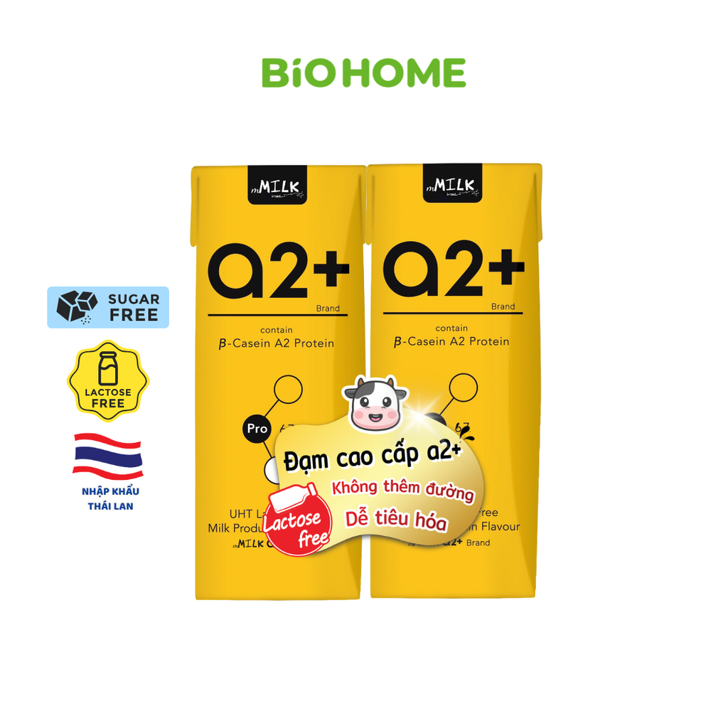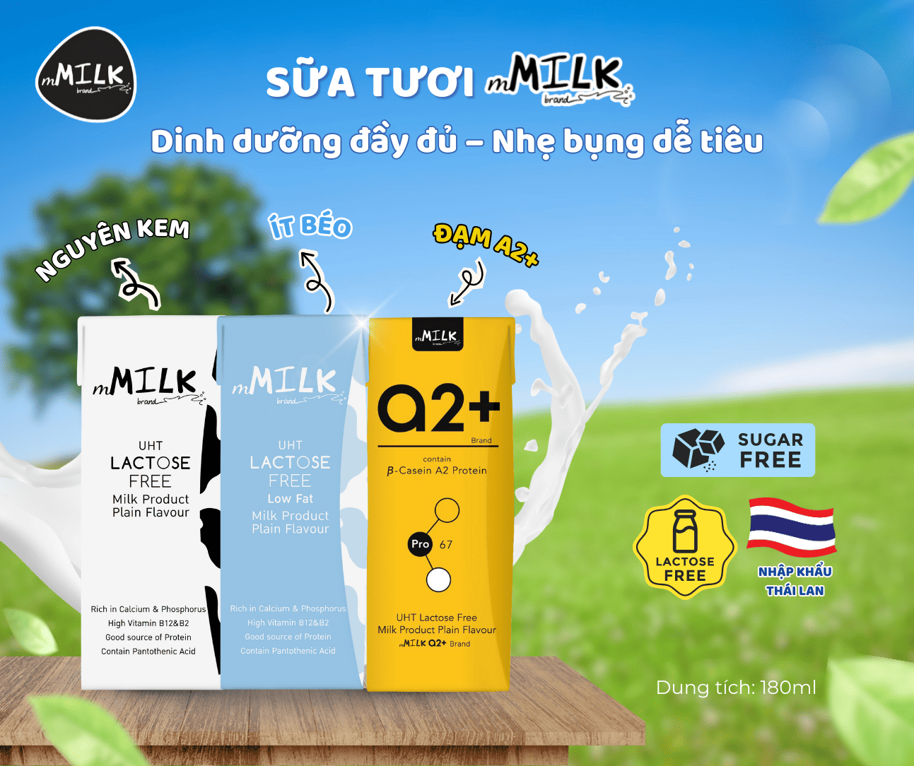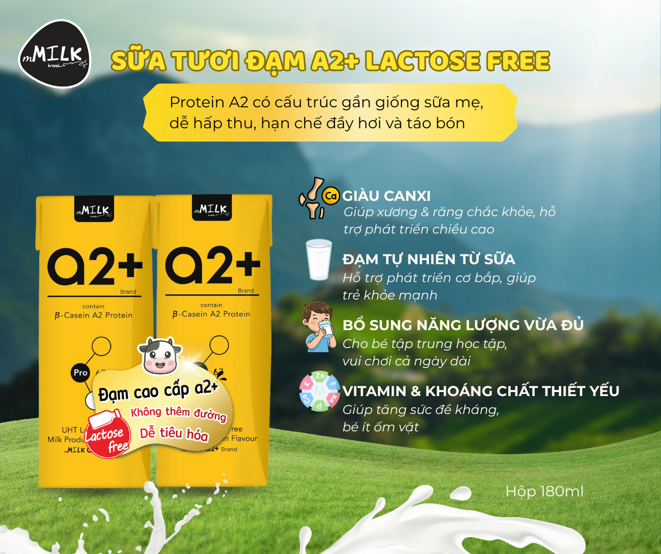 Sữa bò A2+ không lactose mMilk được sản xuất từ sữa bò chọn lọc, xử lý enzym nhằm giảm hàm lượng lactose. Sản phẩm có vị sữa béo nhẹ tự nhiên, dễ uống, phù hợp cho nhu cầu sử dụng hằng ngày của cả gia đình. Đóng gói hộp giấy Tetrapak tiện lợi, bảo quản được ở nhiệt độ phòng trước khi mở.
