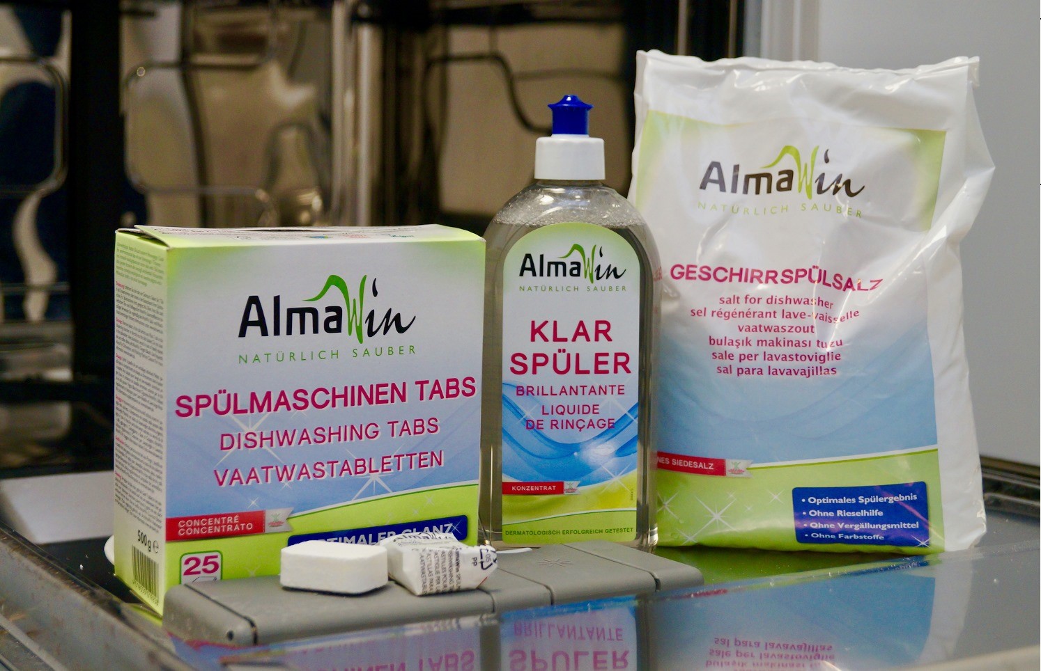 Bộ sản phẩm dùng cho máy rửa bát thông thường sẽ có 3 sản phẩm: Viên/ bột rửa bát, muối và nước bóng cho máy rửa bát. Nhiều người sẽ thắc mắc rằng, viên / bột rửa bát dùng để rửa bát rồi, vậy muối và nước bóng cho máy rửa bát thì dùng để làm gì?