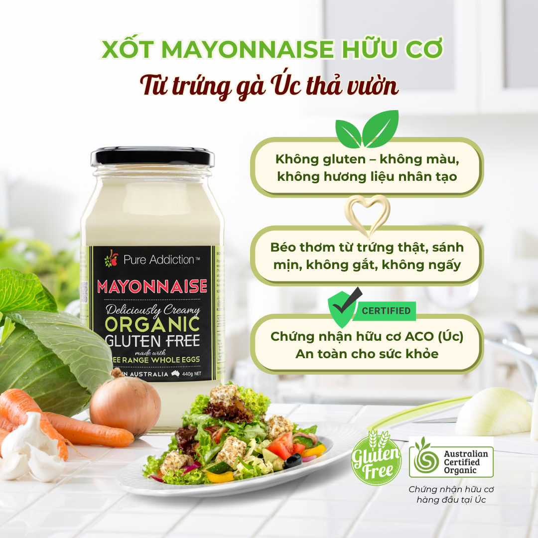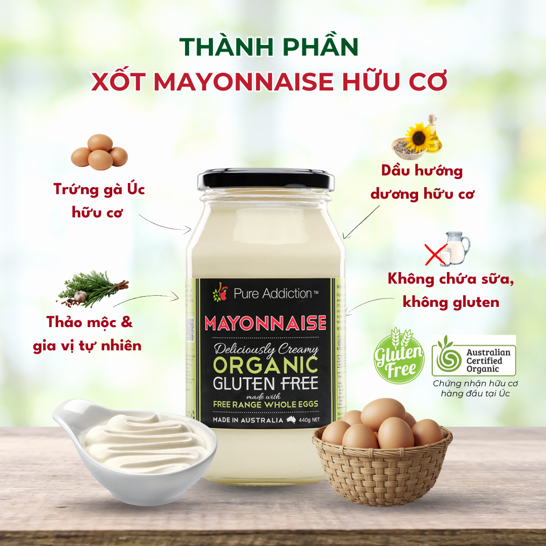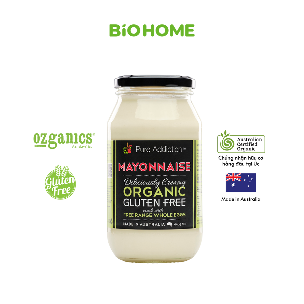 Sốt Mayonnaise Hữu Cơ Pure Addiction – Ozganics là mayonnaise nhập khẩu từ Úc, đạt chứng nhận hữu cơ ACO (Australian Certified Organic). Được làm từ trứng gà hữu cơ nuôi thả tự nhiên, dầu hướng dương hữu cơ giàu oleic và gia vị tự nhiên, sản phẩm mang đến hương vị béo mịntự nhiên, dễ ăn, không gây ngấy, là lựa chọn lý tưởng cho gian bếp theo đuổi lối sống lành mạnh.
